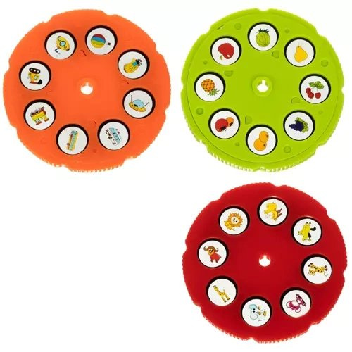 3 SLIKE S SLIKAMA - bile su dio seta 3 diska s 24 slike na različite teme: alati, vozila, životinje i voće. Zahvaljujući njima, dijete počinje učiti crtati povlačenjem crta duž određenog uzorka.