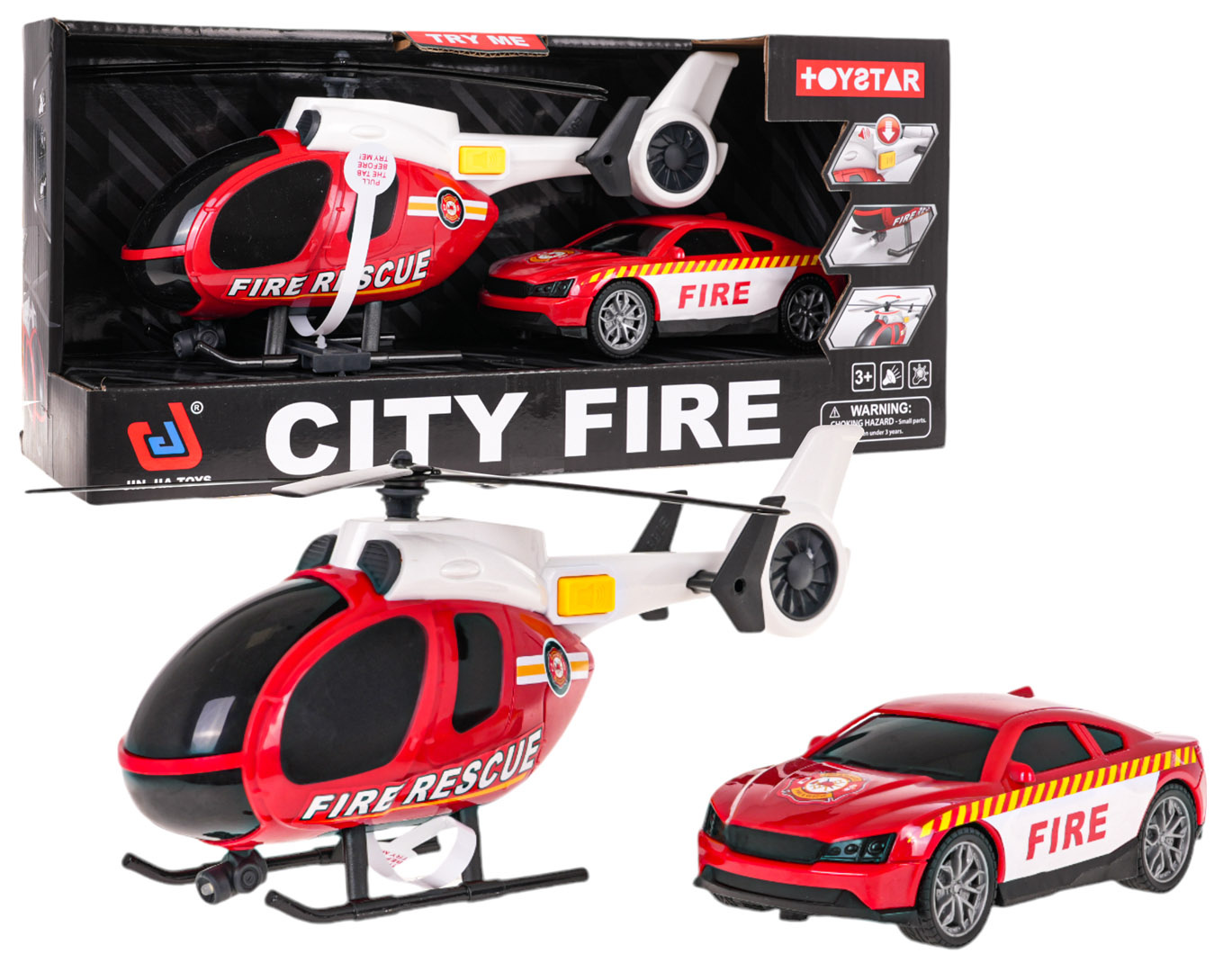 Interaktivni set vatrogasne postrojbe, helikopter i autić za djecu od 3 godine. Set je izrađen od najkvalitetnije plastike u živim bojama. Helikopter ima gumb za aktiviranje svjetlosnih i zvučnih funkcija. Pritiskom na gumb aktivira se prednje i stražnje osvjetljenje helikoptera te zvukovi motora, alarmi i zvukovi leta. Helikopter je napajan baterijama tipa 3 x AG13 (u pakiranju). Vatrogasno vozilo ima gumene gume i slobodni kotač, koji olakšava njegovo slobodno kretanje po podlozi. Helikopterske lopatice možemo okretati ručno.