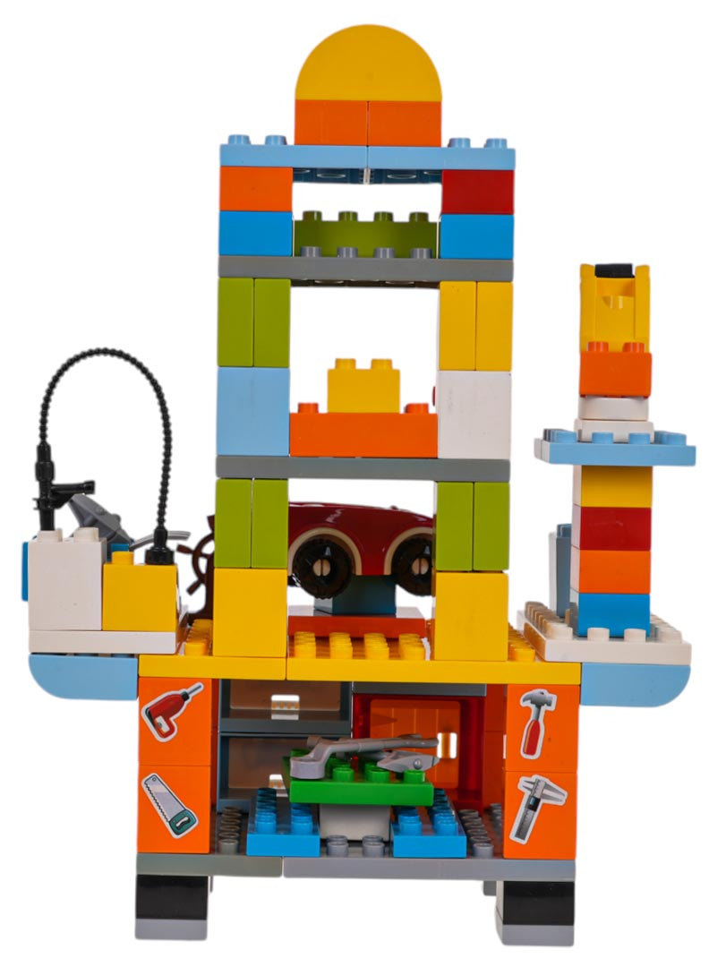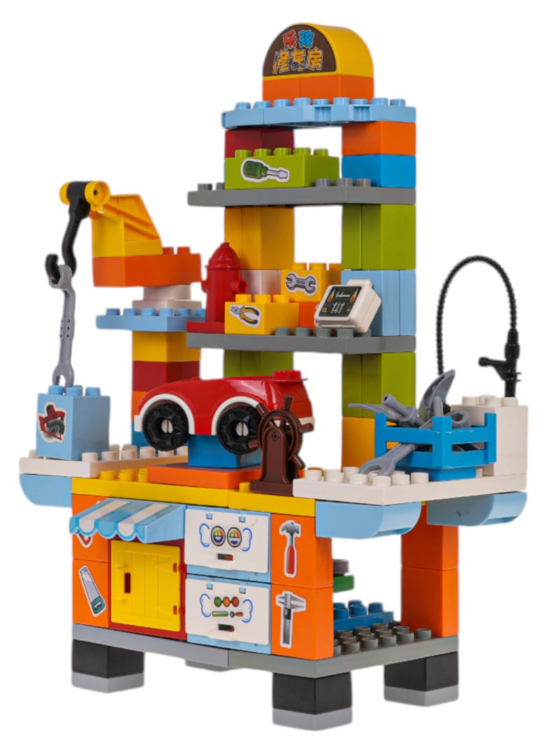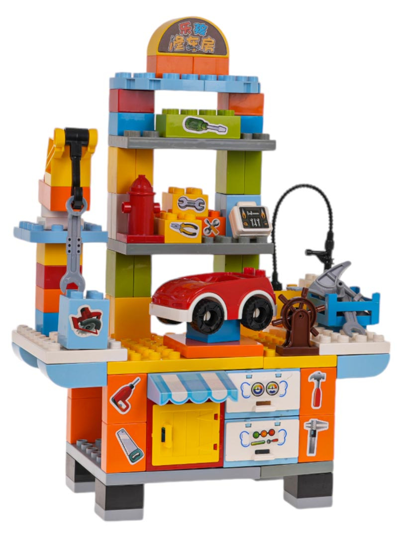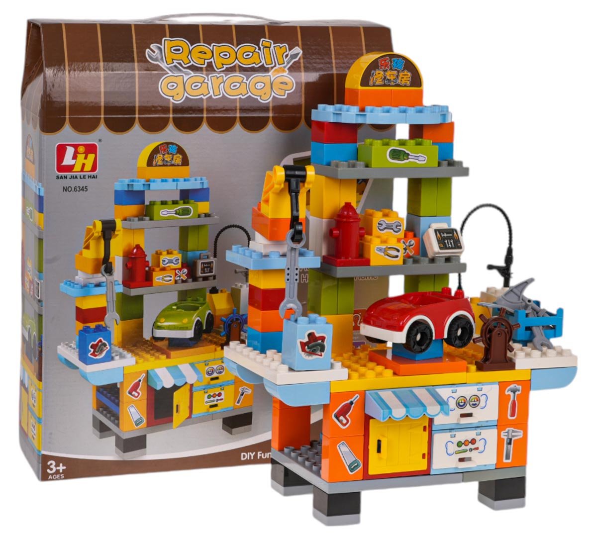Kreativni set građevinskih kockica za izgradnju automobilske radionice za djecu od 3 godine. Set izrađen od najkvalitetnije plastike u raznim bojama. Set sadrži do 110 elemenata koji omogućuju sastavljanje funkcionalne automehaničarske radionice s vozilom, alatom i opremom za popravak. Među radioničkom opremom djeca će pronaći m.in. takvi alati kao odvijači ili francuski ključ, kao i stroj za pumpanje guma i dizalica. Set potiče kreativnu igru i uči rješavanju problema.