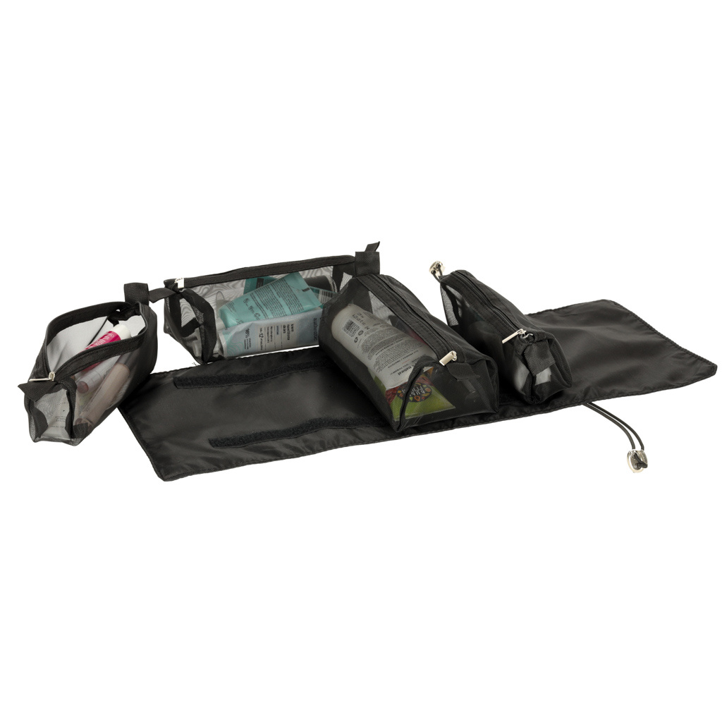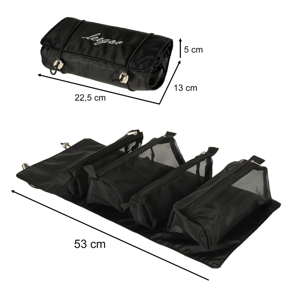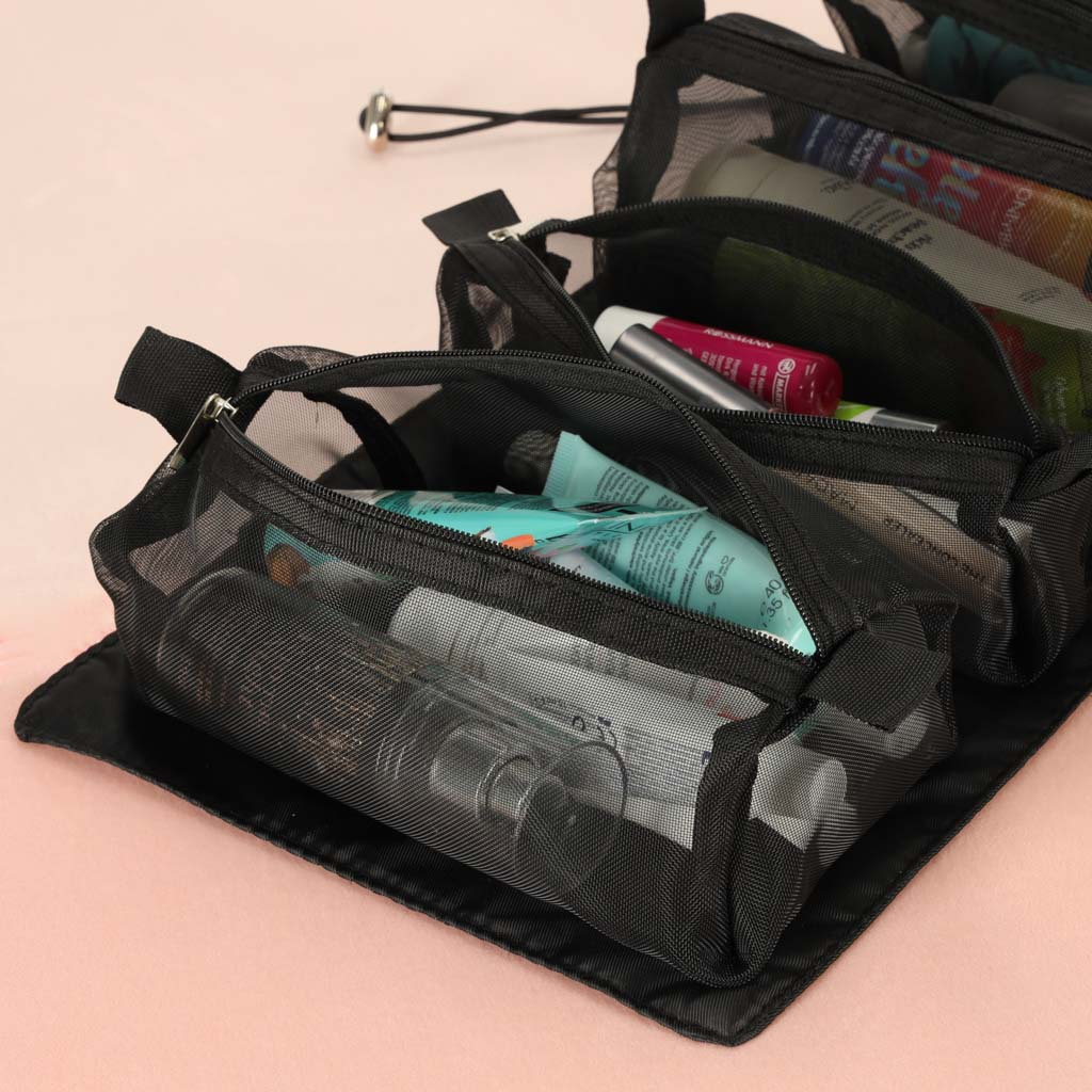 Crna putna kozmetička torbica - može se smotati kako bi zauzimala manje mjesta u prtljazi. Ima četiri pretinca koja se mogu izvaditi. Zidovi pretinaca izrađeni su od mrežaste tkanine koja olakšava pronalaženje proizvoda i također osigurava dobro prozračivanje mokrih omota.