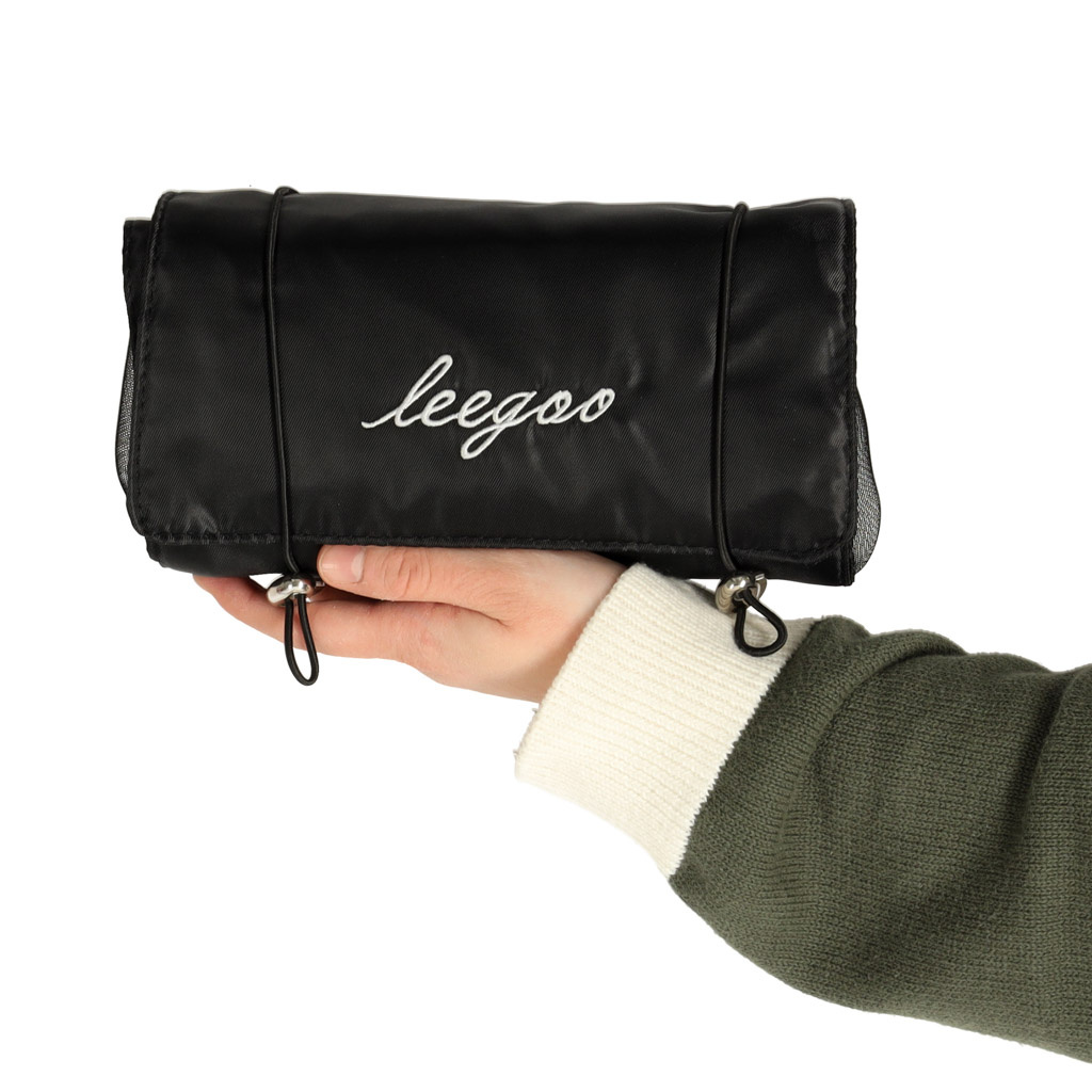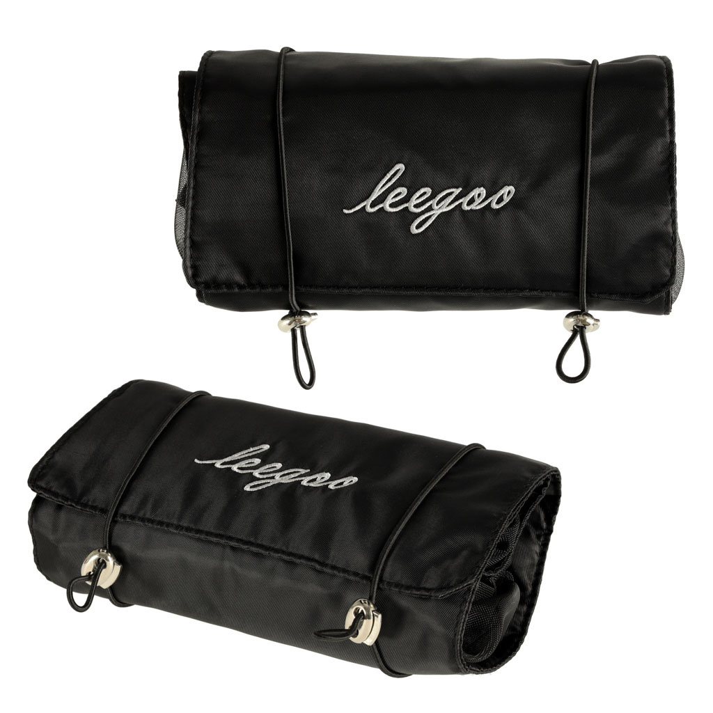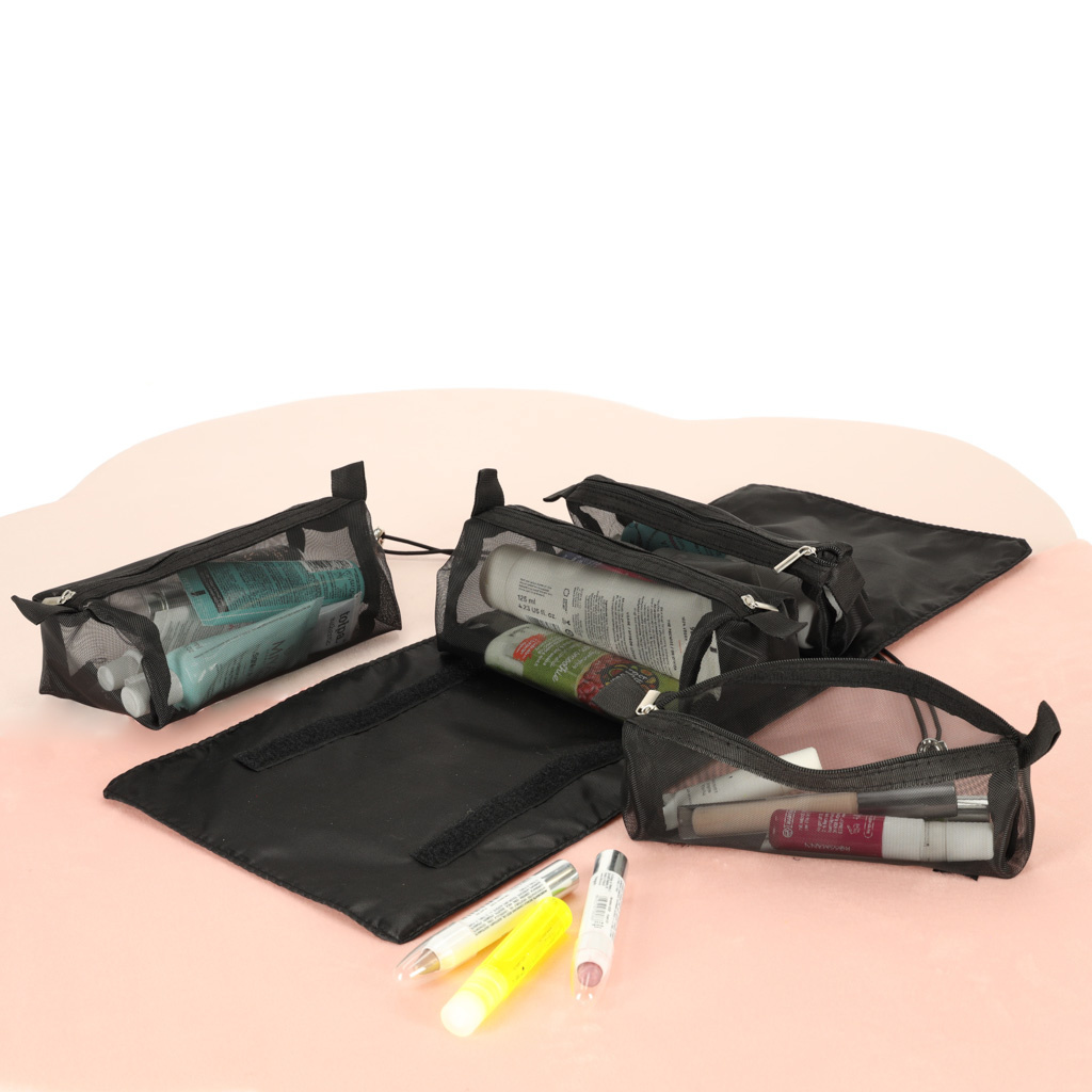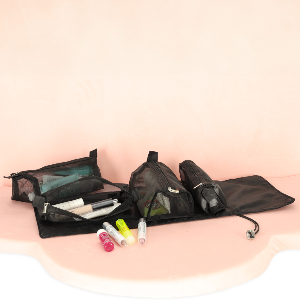 Crna putna kozmetička torbica - može se smotati kako bi zauzimala manje mjesta u prtljazi. Ima četiri pretinca koja se mogu izvaditi. Zidovi pretinaca izrađeni su od mrežaste tkanine koja olakšava pronalaženje proizvoda i također osigurava dobro prozračivanje mokrih omota.
