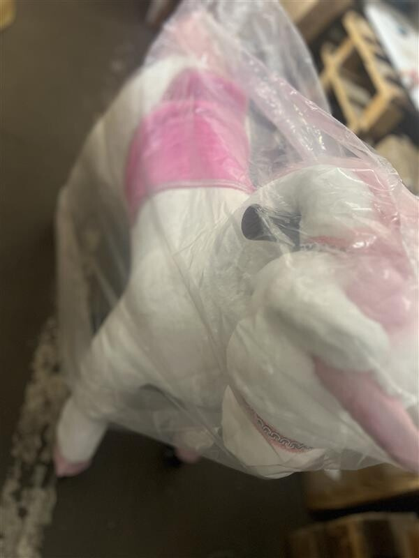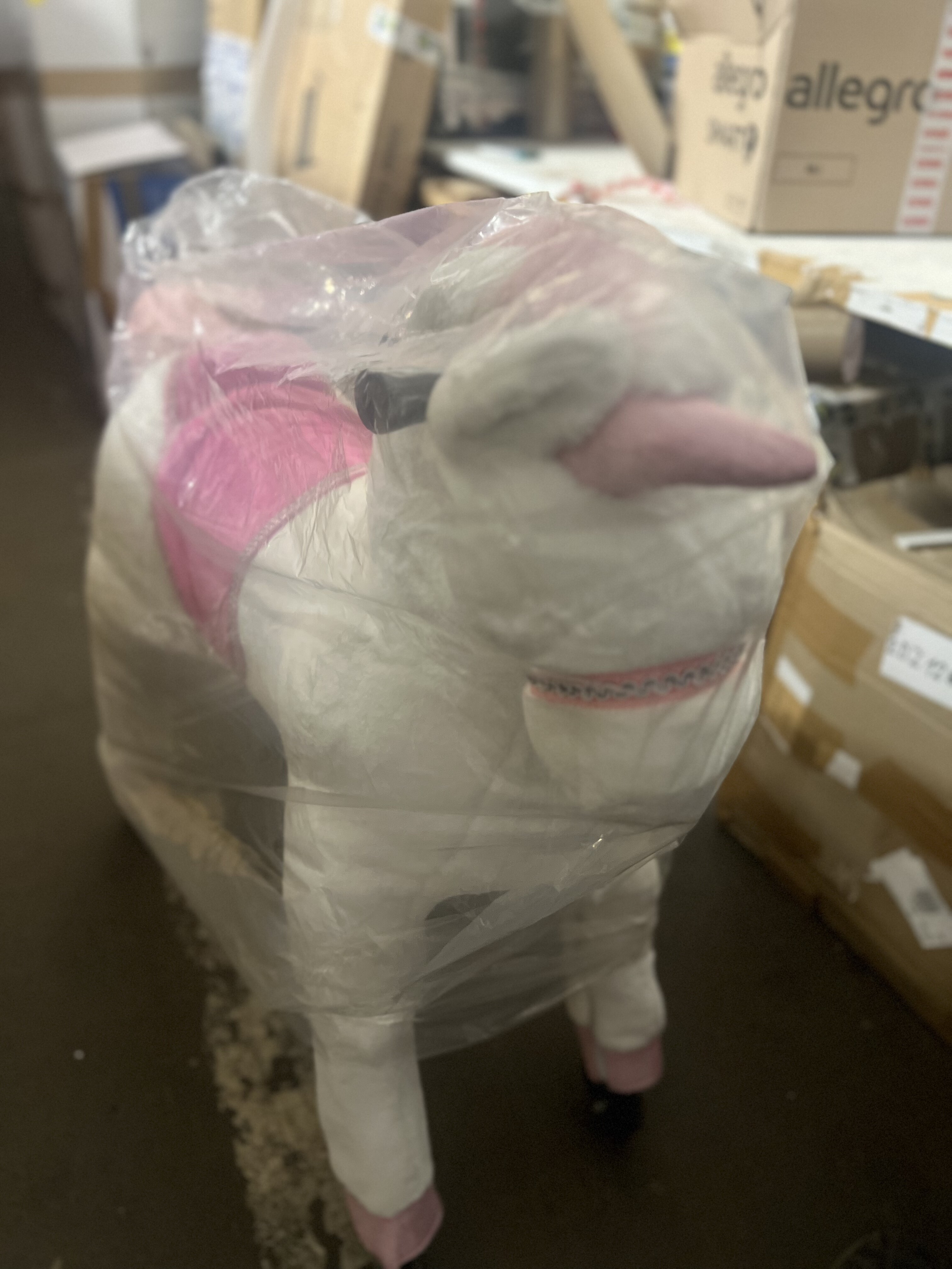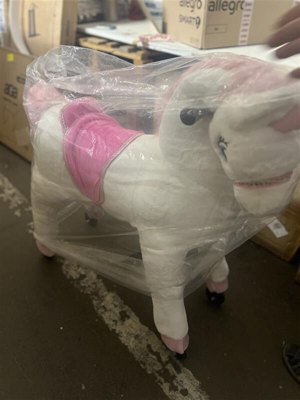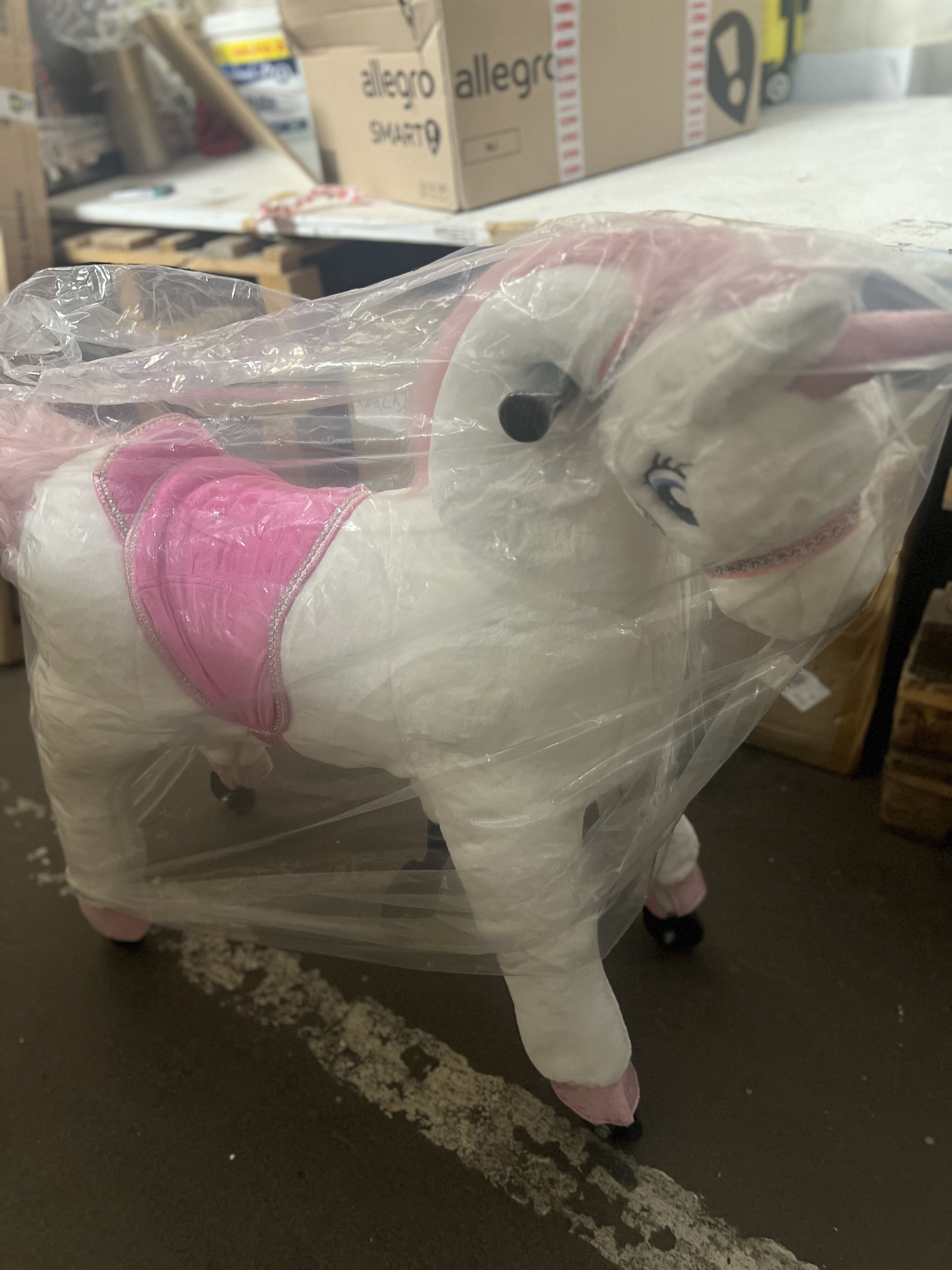 Ponosno izgledajući jahaći konj jednorog Unicorn na kotačima. Konj se pokrene pri pravilnom pokretu jahača. Konjića se može usmjeriti desno i lijevo. Konj je na površini prekriven mekim plišem i stoga je vrlo ugodan na dodir. Opremljeno patentnim zatvaračima i uklonjivim vanjskim pokrovom. Konjić je opremljen ručkama i pedalama za noge. Robusna metalna konstrukcija osigurava stabilnost i sigurnost pri korištenju. Nosivost min. 25 kg do max. 65 kg.Glavne značajke: visina sedla 68 cm ljuljajući pokreti tijekom vožnje treniraju ravnotežu, koordinaciju i spretnost