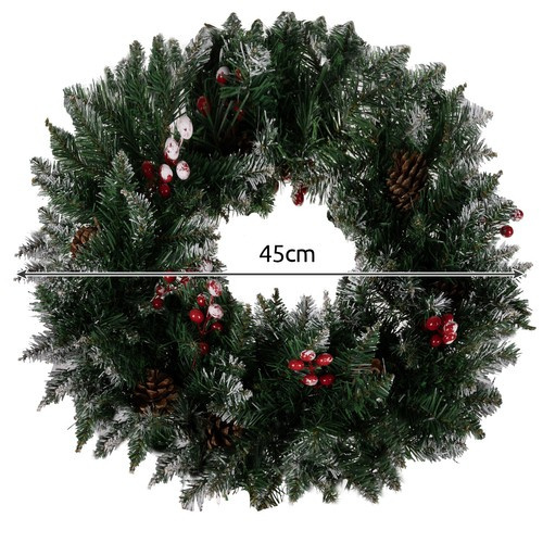 SPECIFIKACIJE - materijal: iglice: PVC, okvir: željezo s umjetnim bobicama i češerima; promjer: 45 cm; duljina grančice: 12-14 cm; plastičnost (mogućnost savijanja): da; unutarnja/vanjska upotreba: da; težina: 0,7 kg; težina pakiranja: 0,858 kg.