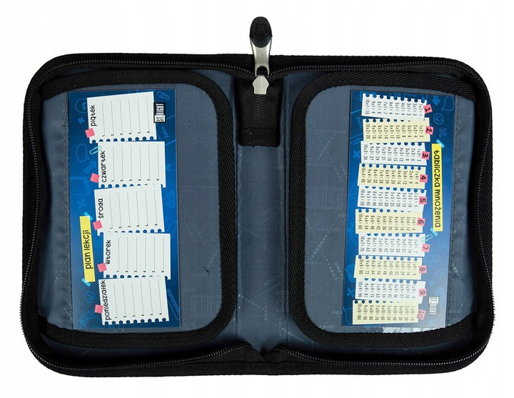 Na unutarnjim preklopima su prozirne folije za raspored sati, malu tablicu množenja itd.