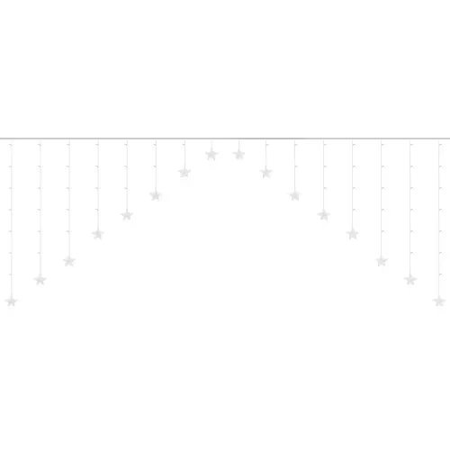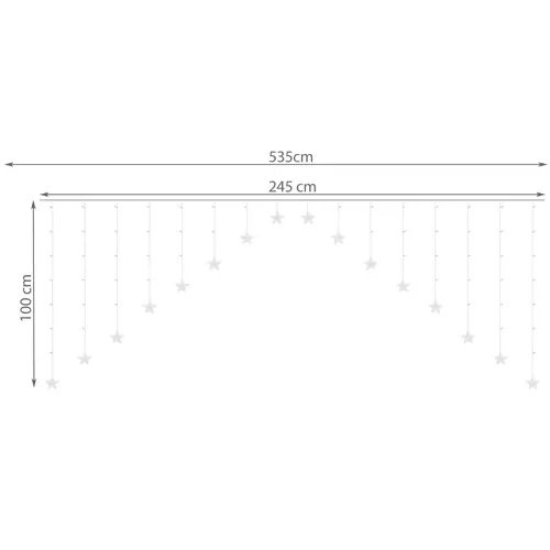 SPECIFIKACIJE - broj režima: 8; tip osvjetljenja: LED; boja svjetla: topla bijela; boja kabela: prozirna; broj LED: 136; klasa vodootpornosti: IP44; daljinsko upravljanje: da; napajanje: električna mreža; snaga: 1,2W; dimenzije jedne zvijezde: 9 cm; ukupna duljina: 535 cm; duljina ledenice: 100 cm; težina: 0,388 kg; težina u pakiranju: 0,494 kg.