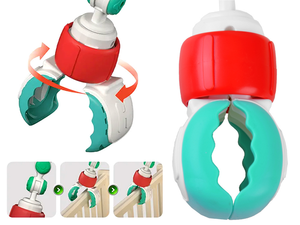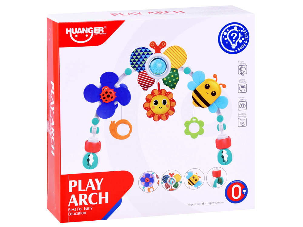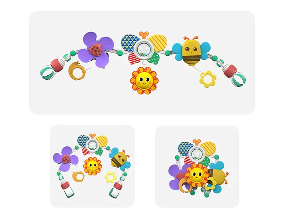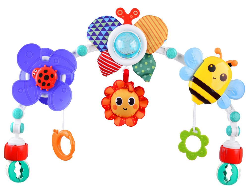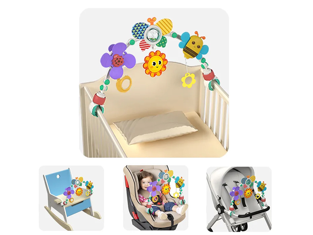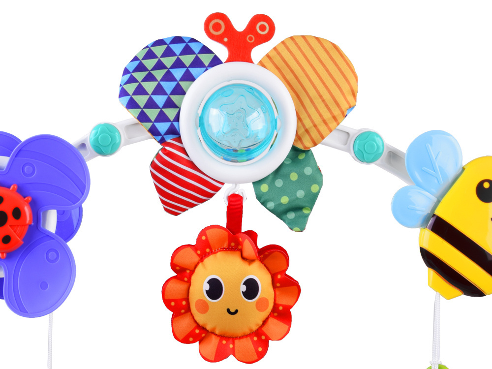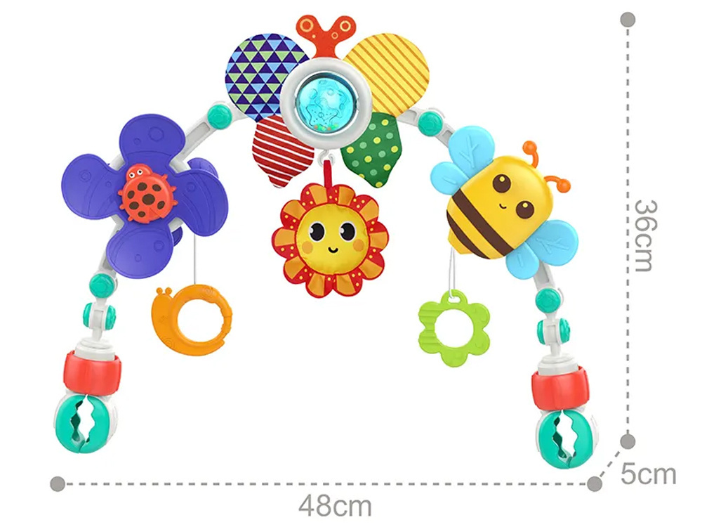 Šareni pokrivač za kolica, autosjedalice i ležaljke je izvrstan izbor za svaku bebu.Igračka se vrlo lako sastavlja, a njezin podesivi kut omogućuje prilagodbu potrebama svakog djeteta.Traka za glavu, na koju su pričvršćene šarene igračke, potiče hvatanje i istezanje ruku, razvija sposobnost koncentracije djeteta i oblikuje njegovu maštu.Igračke obješene na luku omogućit će svakom mališanu razvijanje grube motorike, fine motorike i osjetila. Kroz igru dijete uči razlikovati oblike i boje.