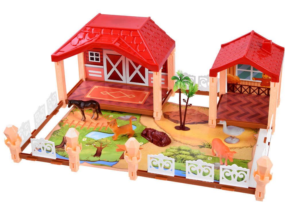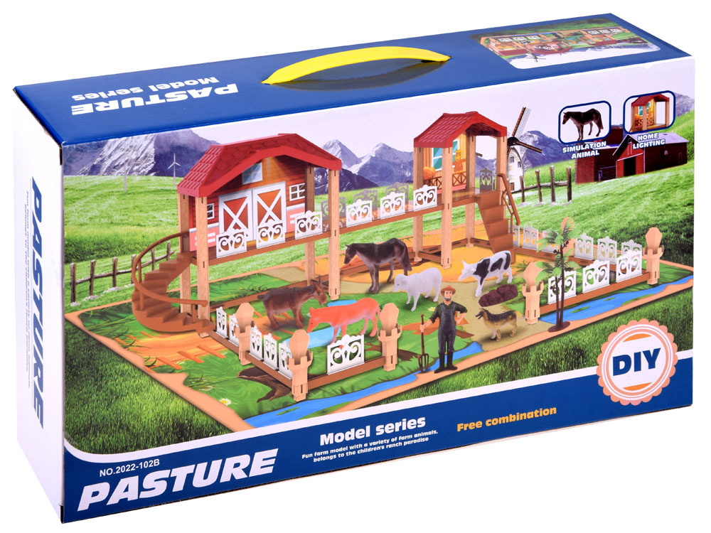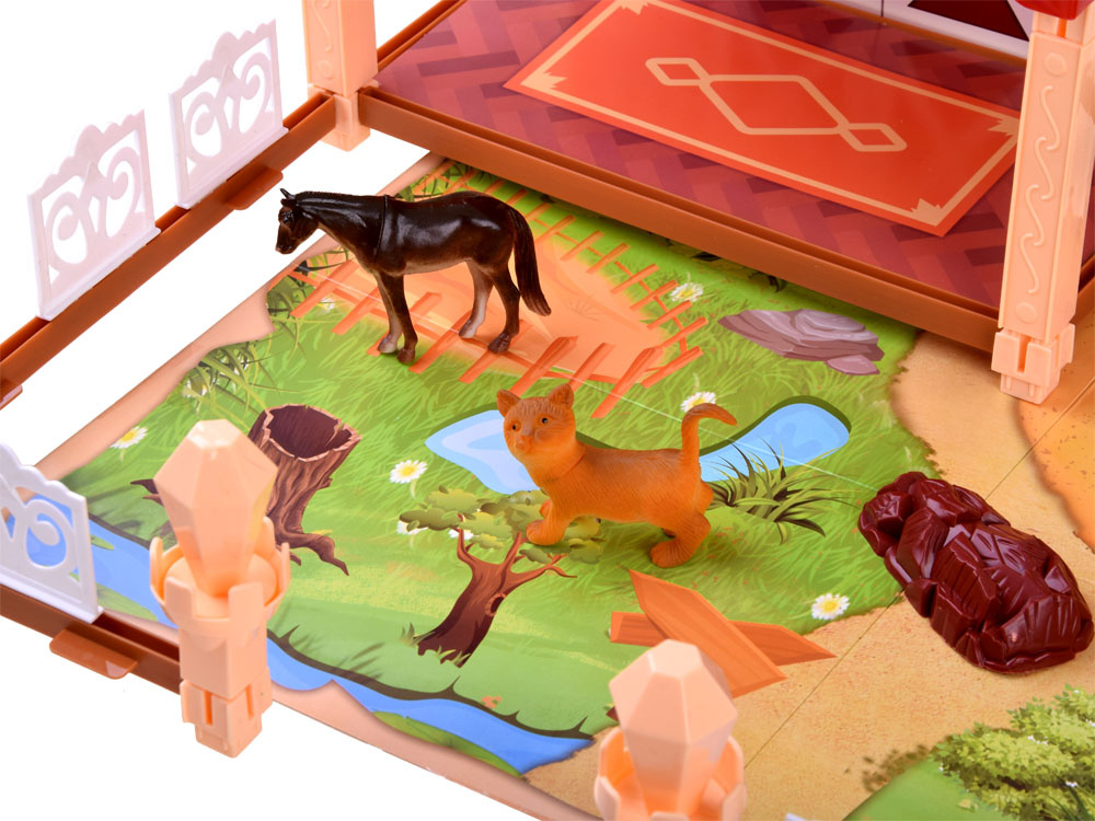 Veliki set farma 2 u 1 je sjajna ideja kako djeci pokazati kako se živi na selu! Set ima mnogo mogućnosti, može se proširiti na dva različita načina i tako stvoriti veliko polje za kreativnost vašeg djeteta. Malo dijete će se moći uživjeti u ulogu farmera i osjećati se kao pravi vlasnik farme.Velika papirnata ploča koja imitira travu, put i jezero je teren vaše parcele, na kojoj možete izgraditi veliku štalu i ogradu za životinje kako vam ne bi pobjegle.Ova igračka pomaže djetetu razvijati maštu, manualnu spretnost i koordinaciju ruke i oka.To je sjajna zabava u koju se može uključiti cijela obitelj i prijatelji! Na farmi se događa puno toga, morate se brinuti o farmi, hraniti životinje: kravu, konja, patku i mačku.Uz pomoć ovog seta dijete se može bolje upoznati sa stvarnošću života na selu.